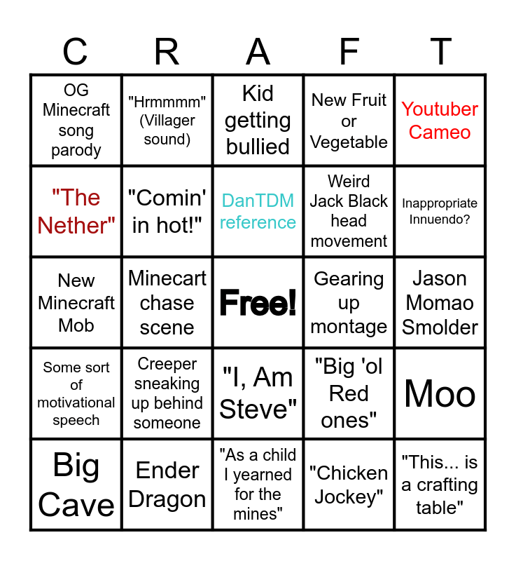This bingo card has a free space and 26 words: "I, Am Steve", "Chicken Jockey", DanTDM reference, Ender Dragon, Youtuber Cameo, OG Minecraft song parody, "The Nether", "Hrmmmm" (Villager sound), Jason Momao Smolder, "Big 'ol Red ones", Weird Jack Black head movement, New Minecraft Mob, Moo, Big Cave, Minecart chase scene, Weird redstone contraption that wouldn't work, New Fruit or Vegetable, Some sort of motivational speech, Kid getting bullied, "This... is a crafting table", Inappropriate Innuendo?, "As a child I yearned for the mines", Gearing up montage, Creeper sneaking up behind someone, "Comin' in hot!" and "Release!".