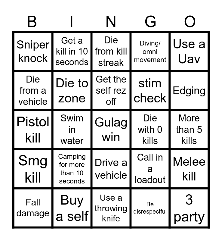 This bingo card has a free space and 24 words: Fall damage, Camping for more than 10 seconds, Get the self rez off, Be disrespectful, Use a Uav, Sniper knock, Get a kill in 10 seconds, Die from kill streak, Die with 0 kills, More than 5 kills, Pistol kill, Die to zone, Call in a loadout, Melee kill, Die from a vehicle, Buy a self, Use a throwing knife, Diving/ omni movement, Edging, Smg kill, Swim in water, Drive a vehicle, stim check and 3 party.