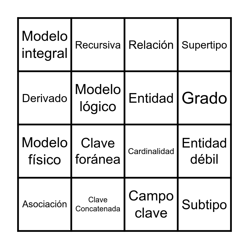 This bingo card has 27 words: Dominio, Atributo, Modelo físico, Clave Primaria, Modelo lógico, Relación, Recursiva, Subtipo, Clave Concatenada, Binaria, Cardinalidad, Supertipo, Diagrama ER, Modelo de contexto, Clave foránea, Entidad fuerte, Entidad, Grado, Normalización, Modelo integral, Campo clave, Redundancia, Entidad débil, Asociación, Tupla, Derivado and Tupla.