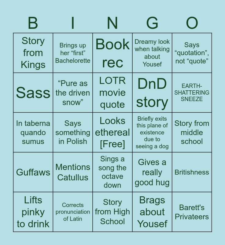 This bingo card has a free space and 33 words: Cries, Brings up Polish food, Says something in Polish, *obscure LOTR trivia*, Guffaws, “Pure as the driven snow”, Says “quotation”, not “quote”, Lifts pinky to drink, Brings up her “first” Bachelorette, Elegant hand gestures while talking, LOTR movie quote, Book rec, Comments on vodka needing to be frozen, Does a tall person thing, Briefly exits this plane of existence due to seeing a dog, EARTH-SHATTERING SNEEZE, Corrects pronunciation of Latin, In taberna quando sumus, Mentions Catullus, Gives a really good hug, Sings a song the octave down, Effuses about her love for her friends, Story from Kings, Story from middle school, Story from High School, Barett's Privateers, Dreamy look when talking about Yousef, DnD story, Sass, Britishness, Receives congrats from a stranger, Brags about Yousef and Complains about Yousef.