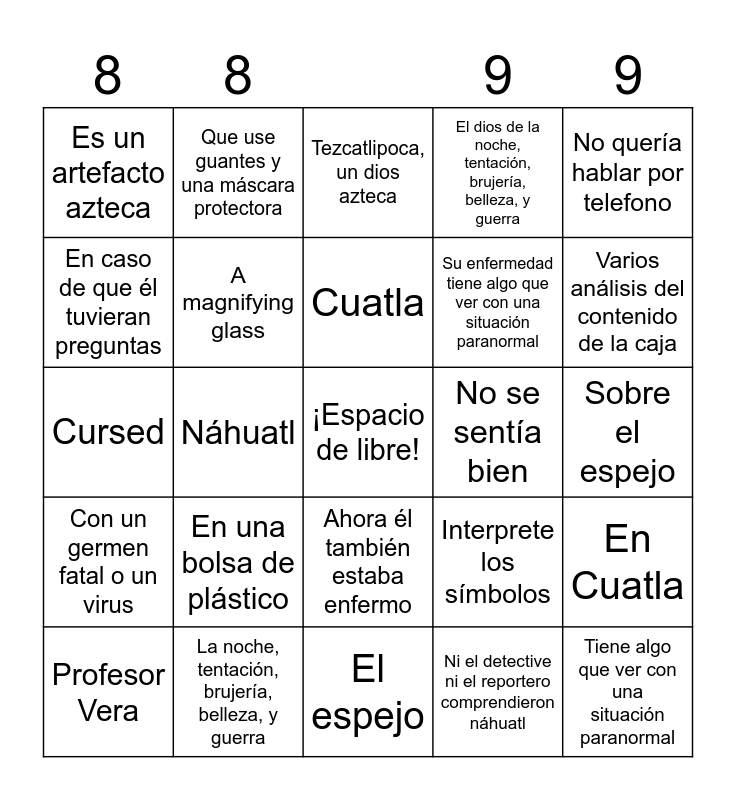 This bingo card has a free space and 24 words: Profesor Vera, En una bolsa de plástico, Cuatla, Ni el detective ni el reportero comprendieron náhuatl, No quería hablar por telefono, Es un artefacto azteca, Que use guantes y una máscara protectora, Tezcatlipoca, un dios azteca, No se sentía bien, Sobre el espejo, Cursed, A magnifying glass, Interprete los símbolos, En Cuatla, En caso de que él tuvieran preguntas, La noche, tentación, brujería, belleza, y guerra, El espejo, El dios de la noche, tentación, brujería, belleza, y guerra, Varios análisis del contenido de la caja, Con un germen fatal o un virus, Náhuatl, Ahora él también estaba enfermo, Su enfermedad tiene algo que ver con una situación paranormal and Tiene algo que ver con una situación paranormal.