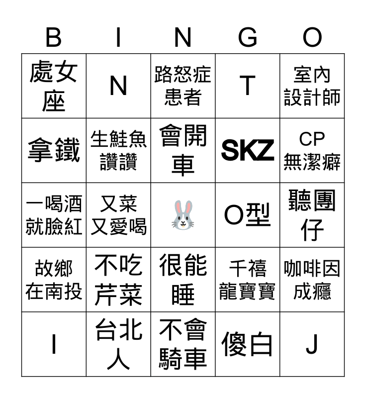 This bingo card has a free space and 24 words: I, 不吃 芹菜, 會開車, 傻白, 室內 設計師, 處女座, N, 路怒症患者, O型, 聽團仔, 一喝酒 就臉紅, 生鮭魚讚讚, 千禧 龍寶寶, 咖啡因 成癮, 拿鐵, 台北人, 不會 騎車, T, CP 無潔癖, 故鄉 在南投, 又菜 又愛喝, 很能睡, SKZ and J.