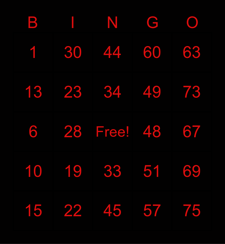 This bingo card has a free space and 24 words: 15, 19, 34, 57, 63, 1, 30, 44, 48, 67, 6, 23, 51, 69, 13, 22, 45, 60, 73, 10, 28, 33, 49 and 75.