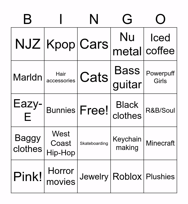 This bingo card has a free space and 24 words: West Coast Hip-Hop, Horror movies, Cats, Pink!, Iced coffee, NJZ, Marldn, Kpop, Black clothes, Skateboarding, Bass guitar, Eazy-E, Keychain making, Minecraft, Hair accessories, Roblox, R&B/Soul, Cars, Powerpuff Girls, Bunnies, Plushies, Baggy clothes, Nu metal and Jewelry.