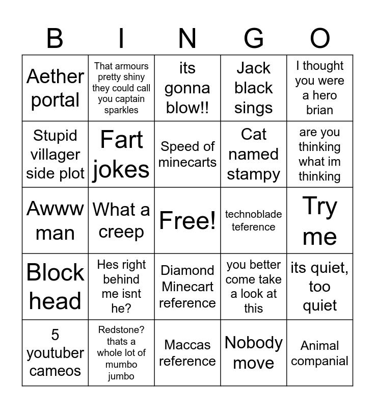 This bingo card has a free space and 24 words: Hes right behind me isnt he?, Redstone? thats a whole lot of mumbo jumbo, Speed of minecarts, 5 youtuber cameos, I thought you were a hero brian, Aether portal, Stupid villager side plot, That armours pretty shiny they could call you captain sparkles, technoblade teference, Diamond Minecart reference, Cat named stampy, Awww man, you better come take a look at this, its quiet, too quiet, Fart jokes, Nobody move, Try me, its gonna blow!!, are you thinking what im thinking, What a creep, Animal companial, Block head, Jack black sings and Maccas reference.
