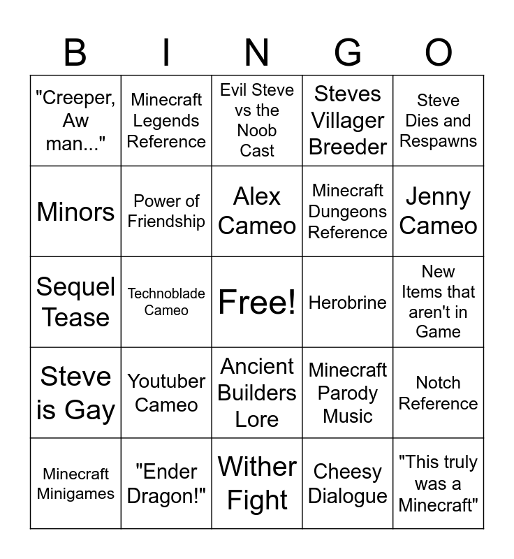 This bingo card has a free space and 24 words: Youtuber Cameo, "Ender Dragon!", Alex Cameo, Minecraft Minigames, Steve Dies and Respawns, "Creeper, Aw man...", Minors, Minecraft Legends Reference, Herobrine, Ancient Builders Lore, Minecraft Dungeons Reference, Sequel Tease, Minecraft Parody Music, Notch Reference, Power of Friendship, Cheesy Dialogue, New Items that aren't in Game, Evil Steve vs the Noob Cast, Jenny Cameo, Technoblade Cameo, "This truly was a Minecraft", Steve is Gay, Steves Villager Breeder and Wither Fight.