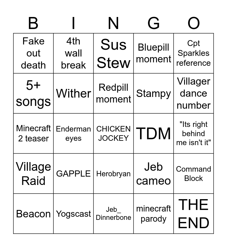 This bingo card has a free space and 24 words: GAPPLE, Yogscast, Redpill moment, Beacon, Cpt Sparkles reference, Fake out death, 5+ songs, 4th wall break, TDM, Herobryan, Stampy, Minecraft 2 teaser, Jeb cameo, Command Block, Wither, minecraft parody, "Its right behind me isn't it", Sus Stew, Villager dance number, Enderman eyes, THE END, Village Raid, Bluepill moment and Jeb_ Dinnerbone.