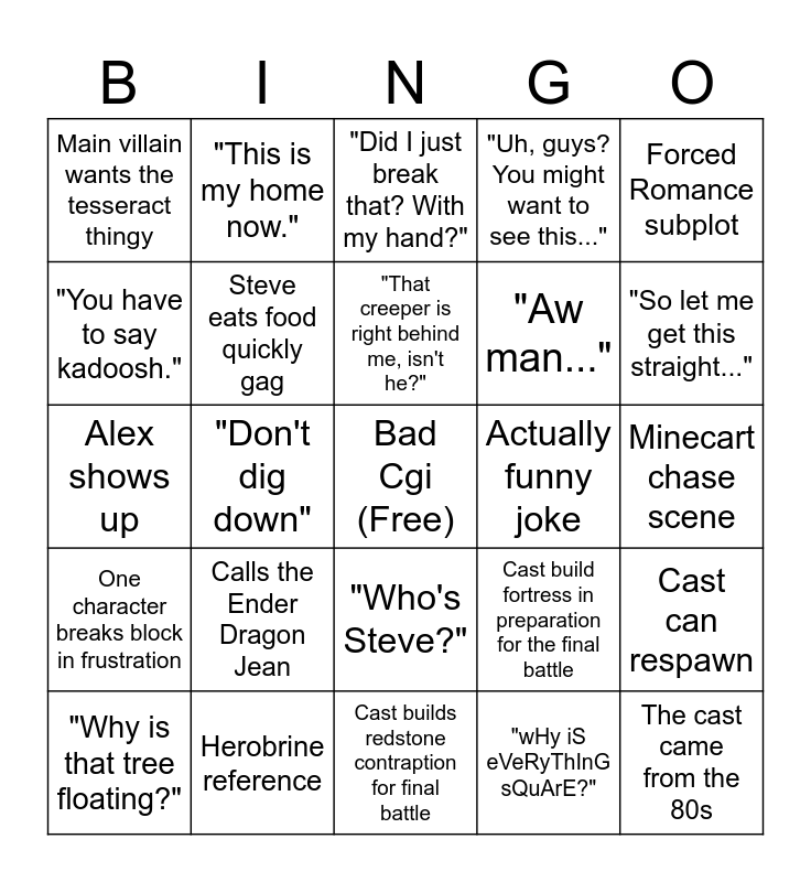This bingo card has a free space and 24 words: Calls the Ender Dragon Jean, Herobrine reference, "That creeper is right behind me, isn't he?", "Why is that tree floating?", Forced Romance subplot, Main villain wants the tesseract thingy, "You have to say kadoosh.", "This is my home now.", Actually funny joke, "Who's Steve?", "Aw man...", Alex shows up, Cast build fortress in preparation for the final battle, Cast can respawn, Steve eats food quickly gag, "wHy iS eVeRyThInG sQuArE?", Minecart chase scene, "Did I just break that? With my hand?", "So let me get this straight...", "Don't dig down", The cast came from the 80s, One character breaks block in frustration, "Uh, guys? You might want to see this..." and Cast builds redstone contraption for final battle.