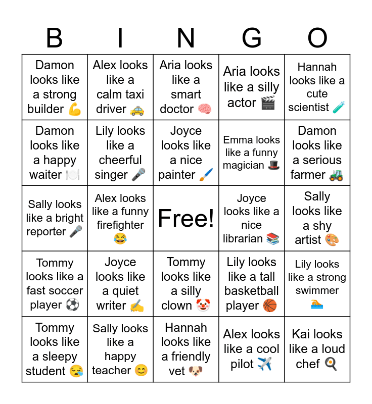 This bingo card has a free space and 30 words: Sally looks like a happy teacher ๐, Kai looks like a sleepy baker ๐ด, Alex looks like a funny firefighter ๐, Emma looks like a kind nurse ๐, Damon looks like a strong builder ๐ช, Aria looks like a smart doctor ๐ง , Lily looks like a cheerful singer ๐ค, Tommy looks like a silly clown ๐คก, Joyce looks like a nice librarian ๐, Hannah looks like a friendly vet ๐ถ, Sally looks like a shy artist ๐จ, Kai looks like a loud chef ๐ณ, Alex looks like a cool pilot โ๏ธ, Emma looks like a brave police officer ๐, Damon looks like a serious farmer ๐, Aria looks like a sweet dancer ๐, Lily looks like a tall basketball player ๐, Tommy looks like a fast soccer player โฝ, Joyce looks like a quiet writer โ๏ธ, Hannah looks like a cute scientist ๐งช, Sally looks like a bright reporter ๐ค, Kai looks like a neat hairdresser ๐โโ๏ธ, Alex looks like a calm taxi driver ๐, Emma looks like a funny magician ๐ฉ, Damon looks like a happy waiter ๐ฝ๏ธ, Aria looks like a silly actor ๐ฌ, Lily looks like a strong swimmer ๐, Tommy looks like a sleepy student ๐ช, Joyce looks like a nice painter ๐๏ธ and Hannah looks like a cheerful dentist ๐.