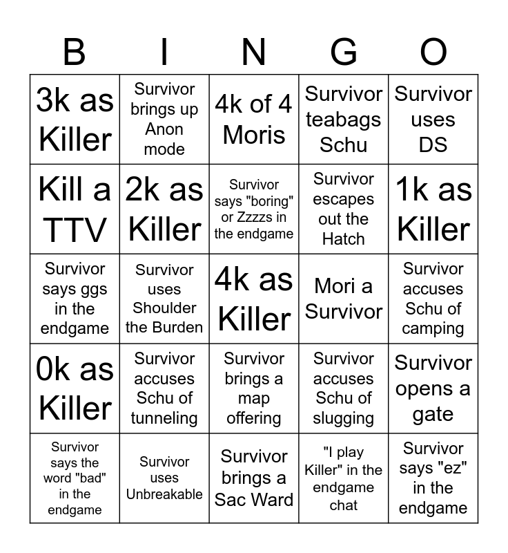 This bingo card has a free space and 24 words: Survivor accuses Schu of tunneling, Survivor uses Unbreakable, Survivor says "boring" or Zzzzs in the endgame, Survivor says the word "bad" in the endgame, Survivor uses DS, 3k as Killer, Kill a TTV, Survivor brings up Anon mode, Mori a Survivor, Survivor brings a map offering, Survivor escapes out the Hatch, Survivor says ggs in the endgame, Survivor accuses Schu of slugging, Survivor opens a gate, 2k as Killer, "I play Killer" in the endgame chat, Survivor accuses Schu of camping, 4k of 4 Moris, 1k as Killer, Survivor uses Shoulder the Burden, Survivor says "ez" in the endgame, 0k as Killer, Survivor teabags Schu and Survivor brings a Sac Ward.