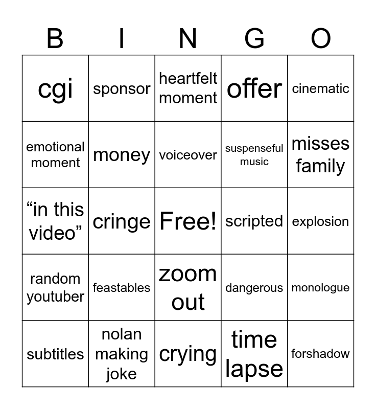 This bingo card has a free space and 24 words: feastables, nolan making joke, voiceover, subtitles, cinematic, cgi, emotional moment, sponsor, scripted, zoom out, suspenseful music, “in this video”, dangerous, monologue, money, time lapse, explosion, heartfelt moment, misses family, cringe, forshadow, random youtuber, offer and crying.