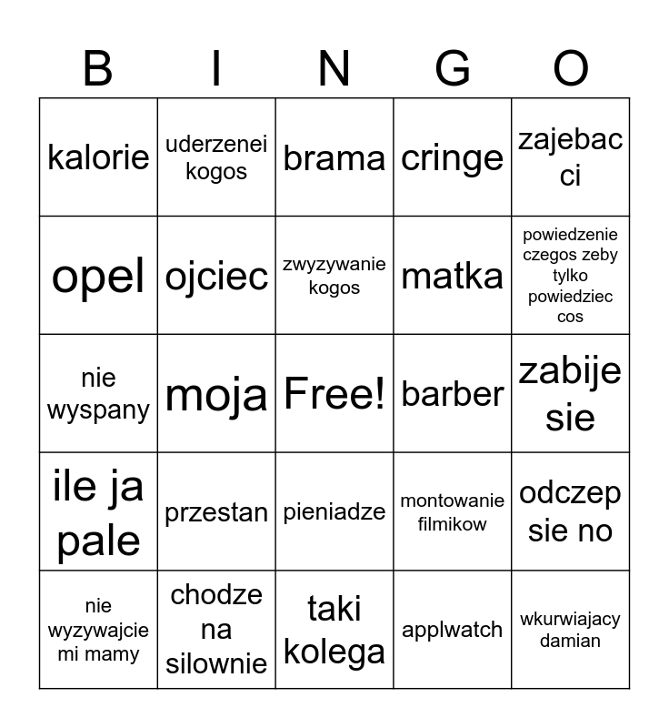 This bingo card has a free space and 24 words: przestan, chodze na silownie, zwyzywanie kogos, nie wyzywajcie mi mamy, zajebac ci, kalorie, opel, uderzenei kogos, barber, pieniadze, matka, nie wyspany, montowanie filmikow, odczep sie no, ojciec, applwatch, zabije sie, brama, powiedzenie czegos zeby tylko powiedziec cos, moja, wkurwiajacy damian, ile ja pale, cringe and taki kolega.