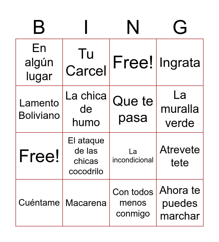 This bingo card has 28 words: Cuando calienta el Sol, Será que no me amas, Con todos menos conmigo, Claridad, Lamento Boliviano, Tu Carcel, Free!, Atrevete tete, Free!, Macarena, Reina de corazones, Ingrata, La Bomba, Voy a pasármela bien, Oye mi amor, Free!, Vuela Vuela, La chica de humo, La incondicional, Ahora te puedes marchar, En algún lugar, Devuélveme a mi chica, Besos de Ceniza, La muralla verde, Cuéntame, El ataque de las chicas cocodrilo, Que te pasa and Lobo Hombre en Paris.