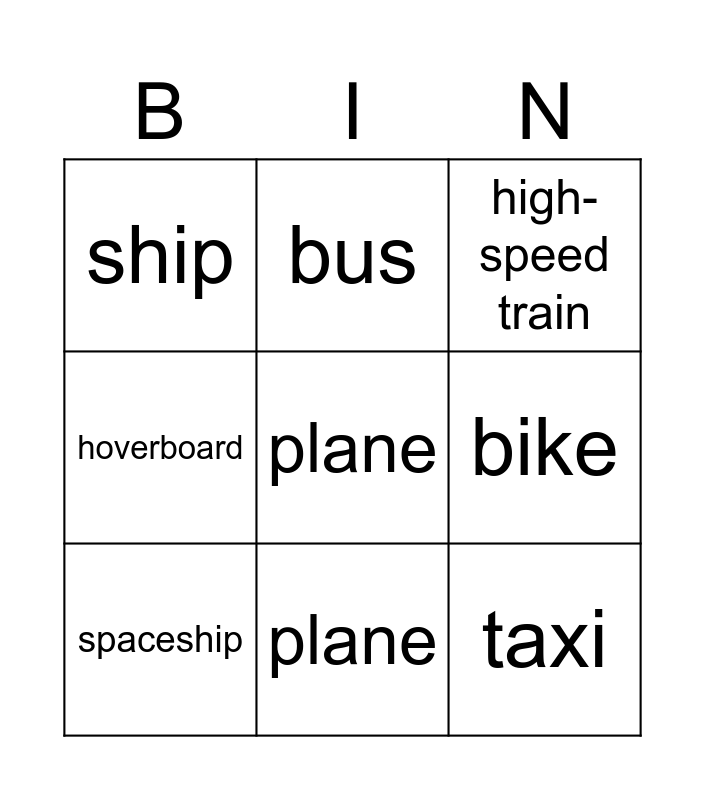 This bingo card has a free space and 9 words: spaceship, high-speed train, bus, hoverboard, ship, bike, taxi, boat and plane.