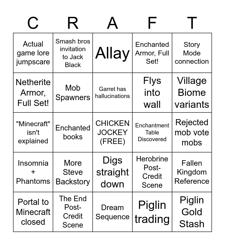 This bingo card has a free space and 24 words: More Steve Backstory, The End Post-Credit Scene, Garret has hallucinations, Portal to Minecraft closed, Story Mode connection, Actual game lore jumpscare, Netherite Armor, Full Set!, Smash bros invitation to Jack Black, Enchantment Table Discovered, Digs straight down, Flys into wall, "Minecraft" isn't explained, Herobrine Post-Credit Scene, Fallen Kingdom Reference, Mob Spawners, Piglin trading, Rejected mob vote mobs, Allay, Village Biome variants, Enchanted books, Piglin Gold Stash, Insomnia + Phantoms, Enchanted Armor, Full Set! and Dream Sequence.