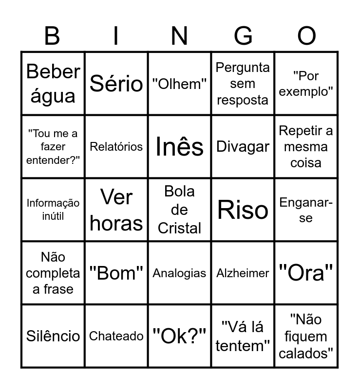 This bingo card has a free space and 27 words: Alzheimer, ''Oh meninos'', Divagar, ''Ok?'', ''Tou me a fazer entender?'', ''Olhem'', Sério, Não completa a frase, Riso, ''Ora'', Informação inútil, Pergunta sem resposta, Silêncio, Chateado, Repetir a mesma coisa, Explocação ''simples'', Relatórios, Inês, ''Bom'', Beber água, Enganar-se, ''Vá lá tentem'', Ver horas, ''Não fiquem calados'', Analogias, ''Por exemplo'' and ''Portanto''.