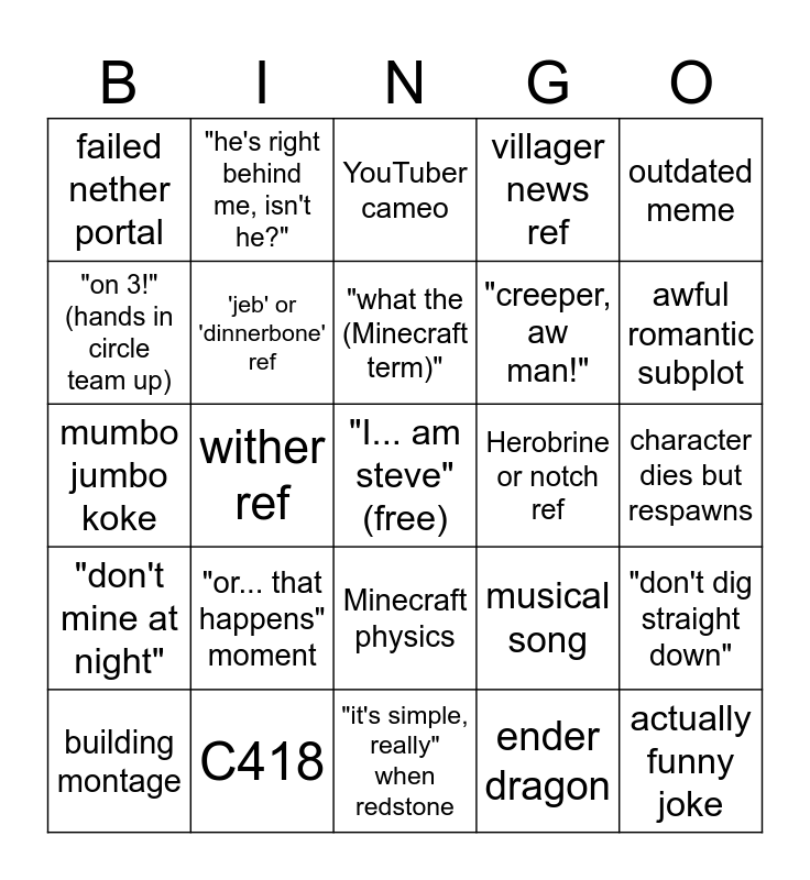 This bingo card has a free space and 24 words: "or... that happens" moment, C418, "what the (Minecraft term)", building montage, outdated meme, failed nether portal, "on 3!" (hands in circle team up), "he's right behind me, isn't he?", Herobrine or notch ref, Minecraft physics, "creeper, aw man!", mumbo jumbo koke, musical song, "don't dig straight down", 'jeb' or 'dinnerbone' ref, ender dragon, character dies but respawns, YouTuber cameo, awful romantic subplot, wither ref, actually funny joke, "don't mine at night", villager news ref and "it's simple, really" when redstone.
