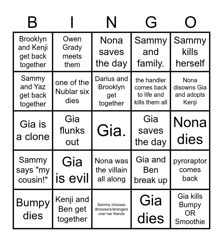 This bingo card has a free space and 24 words: Gia is evil, Kenji and Ben get together, Darius and Brooklyn get together, Bumpy dies, Sammy kills herself, Brooklyn and Kenji get back together, Sammy and Yaz get back together, Owen Grady meets them, Gia saves the day, Nona was the villain all along, the handler comes back to life and kills them all, Gia is a clone, Gia and Ben break up, pyroraptor comes back, one of the Nublar six dies, Gia dies, Nona dies, Nona saves the day, Nona disowns Gia and adopts Kenji, Gia flunks out, Gia kills Bumpy OR Smoothie, Sammy says "my cousin!", Sammy and family. and Sammy chooses dinosaurs/strangers over her friends.