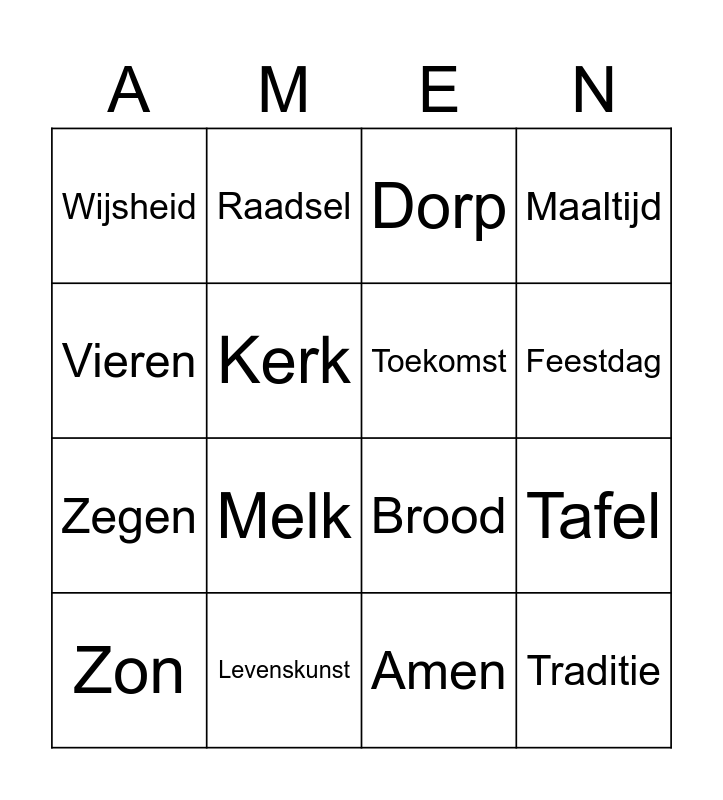 This bingo card has 16 words: Levenskunst, Tafel, Dorp, Wijsheid, Zegen, Raadsel, Brood, Amen, Vieren, Kerk, Zon, Maaltijd, Melk, Feestdag, Toekomst and Traditie.