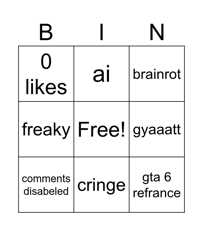 This bingo card has a free space and 8 words: gyaaatt, brainrot, ai, comments disabeled, 0 likes, gta 6 refrance, freaky and cringe.