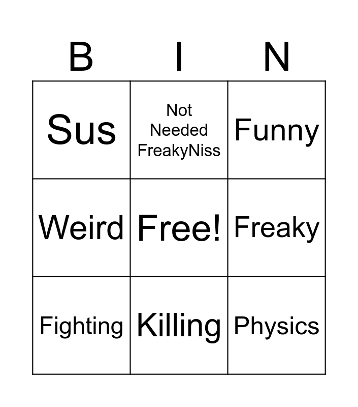 This bingo card has a free space and 8 words: Freaky, Funny, Not Needed FreakyNiss, Fighting, Sus, Physics, Weird and Killing.