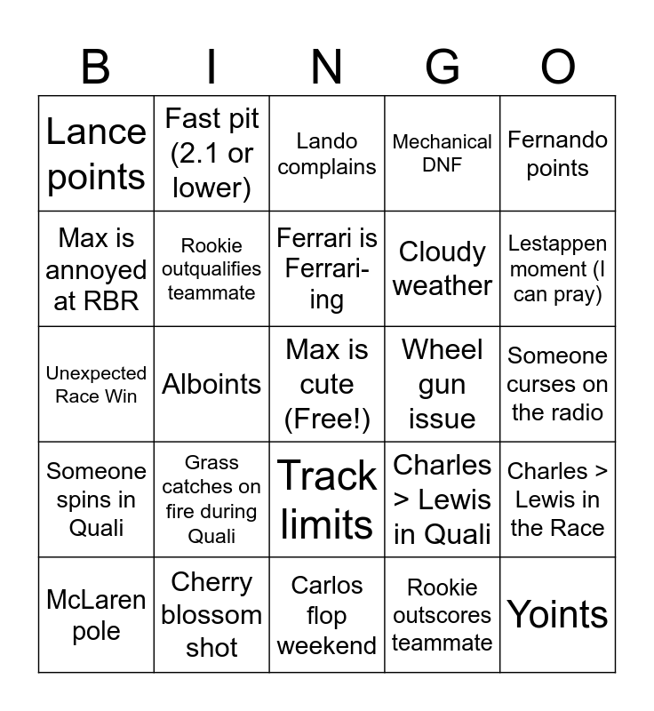 This bingo card has a free space and 24 words: Grass catches on fire during Quali, Cherry blossom shot, Ferrari is Ferrari-ing, McLaren pole, Fernando points, Lance points, Max is annoyed at RBR, Fast pit (2.1 or lower), Wheel gun issue, Track limits, Cloudy weather, Unexpected Race Win, Charles > Lewis in Quali, Charles > Lewis in the Race, Rookie outqualifies teammate, Rookie outscores teammate, Someone curses on the radio, Lando complains, Lestappen moment (I can pray), Alboints, Yoints, Someone spins in Quali, Mechanical DNF and Carlos flop weekend.