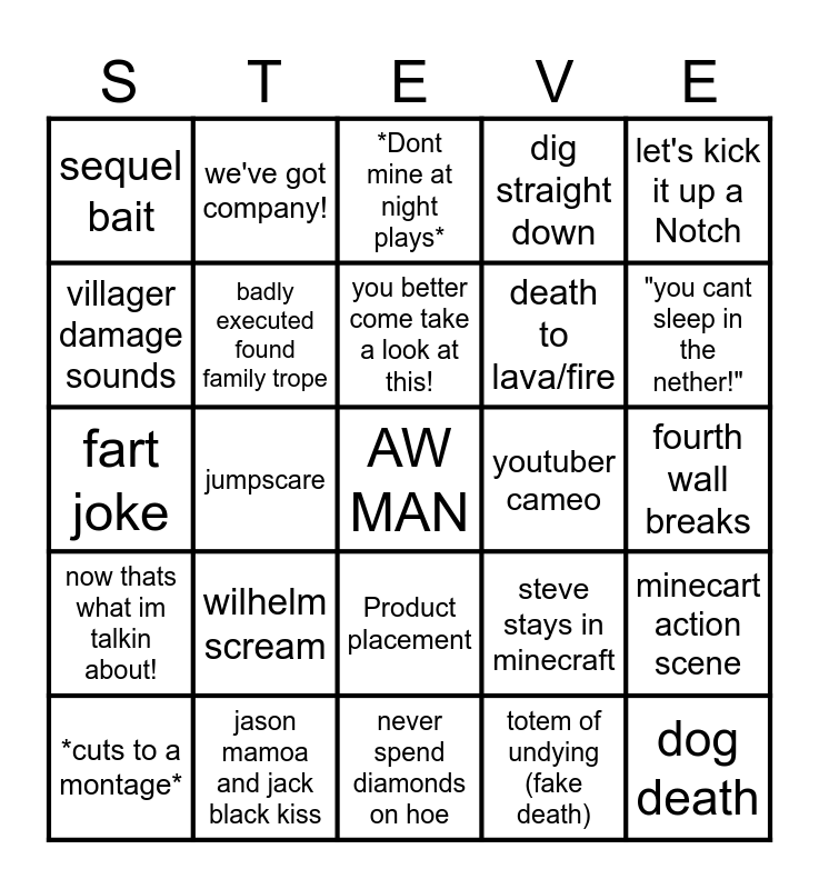 This bingo card has a free space and 34 words: block head, totem of undying (fake death), are you thinking what im thinking, we.... are minecraft, now thats what im talkin about!, badly executed found family trope, let's kick it up a Notch, *cuts to a montage*, we've got company!, jack black singing for no reason, you better come take a look at this!, *Dont mine at night plays*, herobine moment, DIRT HOUSE, youtuber cameo, "you cant sleep in the nether!", jason mamoa and jack black kiss, fart joke, wilhelm scream, steve stays in minecraft, Product placement, random 70s or 80s song, sequel bait, fourth wall breaks, never spend diamonds on hoe, dog death, dig straight down, F bomb, death to lava/fire, villager damage sounds, romance subplot, jumpscare, minecart action scene and creative mode.