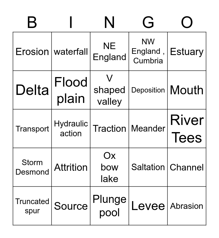 This bingo card has a free space and 24 words: Attrition, Source, V shaped valley, Truncated spur, Estuary, Erosion, Delta, waterfall, Meander, Ox bow lake, Deposition, Transport, Saltation, Channel, Flood plain, Levee, River Tees, NE England, Mouth, Hydraulic action, Abrasion, Storm Desmond, NW England , Cumbria and Plunge pool.