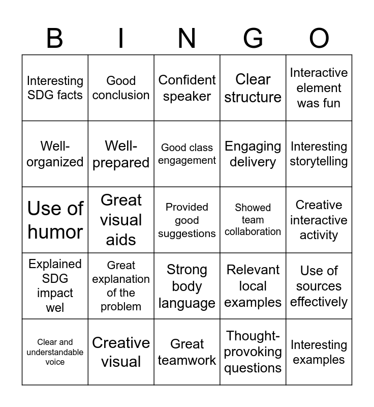 This bingo card has a free space and 24 words: Great explanation of the problem, Creative visual, Good class engagement, Clear and understandable voice, Interactive element was fun, Interesting SDG facts, Well-organized, Good conclusion, Showed team collaboration, Strong body language, Engaging delivery, Use of humor, Relevant local examples, Use of sources effectively, Well-prepared, Thought-provoking questions, Creative interactive activity, Confident speaker, Interesting storytelling, Great visual aids, Interesting examples, Explained SDG impact wel, Clear structure and Great teamwork.