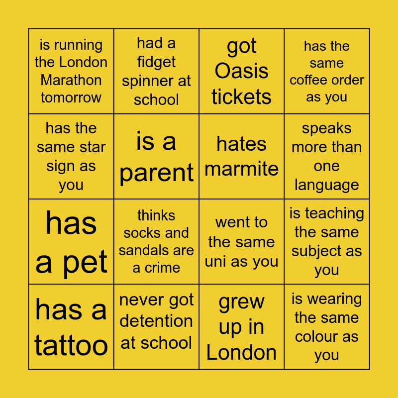 This bingo card has 16 words: never got detention at school, is teaching the same subject as you, got Oasis tickets, is running the London Marathon tomorrow, has a pet, had a fidget spinner at school, went to the same uni as you, grew up in London, has the same star sign as you, is a parent, has a tattoo, has the same coffee order as you, thinks socks and sandals are a crime, speaks more than one language, hates marmite and is wearing the same colour as you.
