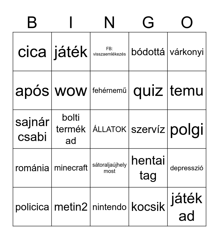 This bingo card has a free space and 24 words: minecraft, metin2, fehérnemű, policica, várkonyi, cica, após, játék, szervíz, sátoraljaújhely most, quiz, sajnár csabi, hentai tag, depresszió, wow, kocsik, polgi, FB: visszaemlékezés, temu, bolti termék ad, játék ad, románia, bódottá and nintendo.