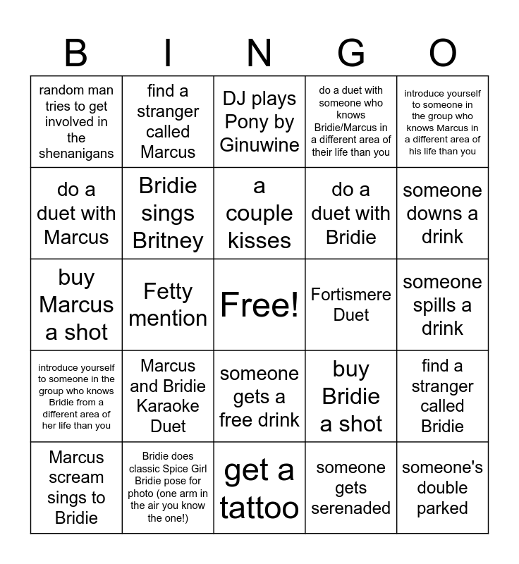 This bingo card has a free space and 29 words: Marcus scream sings to Bridie, Bridie orders a baby guinness, Fetty mention, someone peaks too early, random man tries to get involved in the shenanigans, DJ plays Pony by Ginuwine, Bridie sings Britney, Marcus and Bridie Karaoke Duet, Fortismere Duet, Bridie does classic Spice Girl Bridie pose for photo (one arm in the air you know the one!), someone spills a drink, someone's double parked, get a tattoo, someone gets serenaded, someone downs a drink, Hodder Duet, someone gets a free drink, introduce yourself to someone in the group who knows Bridie from a different area of her life than you, introduce yourself to someone in the group who knows Marcus in a different area of his life than you, buy Marcus a shot, buy Bridie a shot, take a selfie on a stranger's phone if they ask you to take a group photo of them, do a duet with Bridie, do a duet with Marcus, do a duet with someone who knows Bridie/Marcus in a different area of their life than you, find a stranger called Marcus, find a stranger called Bridie, a couple kisses and someone kisses a stranger.