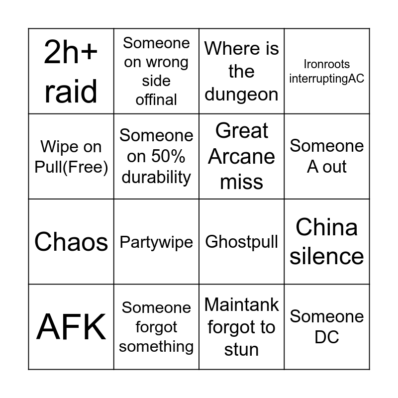 This bingo card has 16 words: Someone forgot something, China silence, Where is the dungeon, 2h+ raid, Chaos, Someone on wrong side offinal, Ghostpull, Maintank forgot to stun, Wipe on Pull(Free), Someone on 50% durability, AFK, Ironroots interruptingAC, Partywipe, Someone A out, Great Arcane miss and Someone DC.