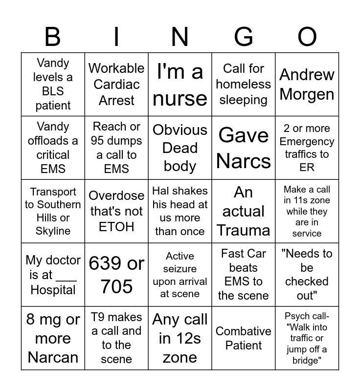 This bingo card has a free space and 24 words: 639 or 705, T9 makes a call and to the scene, Obvious Dead body, 8 mg or more Narcan, Andrew Morgen, Vandy levels a BLS patient, Vandy offloads a critical EMS, Workable Cardiac Arrest, An actual Trauma, Active seizure upon arrival at scene, Gave Narcs, Transport to Southern Hills or Skyline, Fast Car beats EMS to the scene, "Needs to be checked out", Reach or 95 dumps a call to EMS, Combative Patient, Make a call in 11s zone while they are in service, I'm a nurse, 2 or more Emergency traffics to ER, Overdose that's not ETOH, Psych call-"Walk into traffic or jump off a bridge", My doctor is at ___ Hospital, Call for homeless sleeping and Any call in 12s zone.