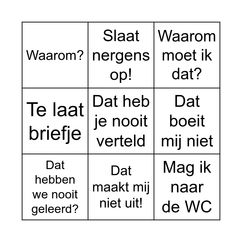 This bingo card has 9 words: Dat hebben we nooit geleerd?, Waarom moet ik dat?, Slaat nergens op!, Te laat briefje, Waarom?, Dat boeit mij niet, Dat heb je nooit verteld, Mag ik naar de WC and Dat maakt mij niet uit!.