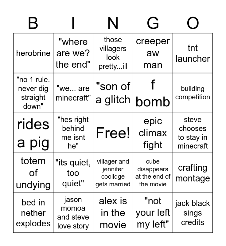 This bingo card has a free space and 24 words: bed in nether explodes, "its quiet, too quiet", "son of a glitch, "not your left my left", tnt launcher, herobrine, "where are we? the end", those villagers look pretty...ill, epic climax fight, steve chooses to stay in minecraft, rides a pig, "we... are minecraft", cube disappears at the end of the movie, crafting montage, "no 1 rule. never dig straight down", jason momoa and steve love story, alex is in the movie, creeper aw man, building competition, totem of undying, "hes right behind me isnt he", villager and jennifer coolidge gets married, f bomb and jack black sings credits.