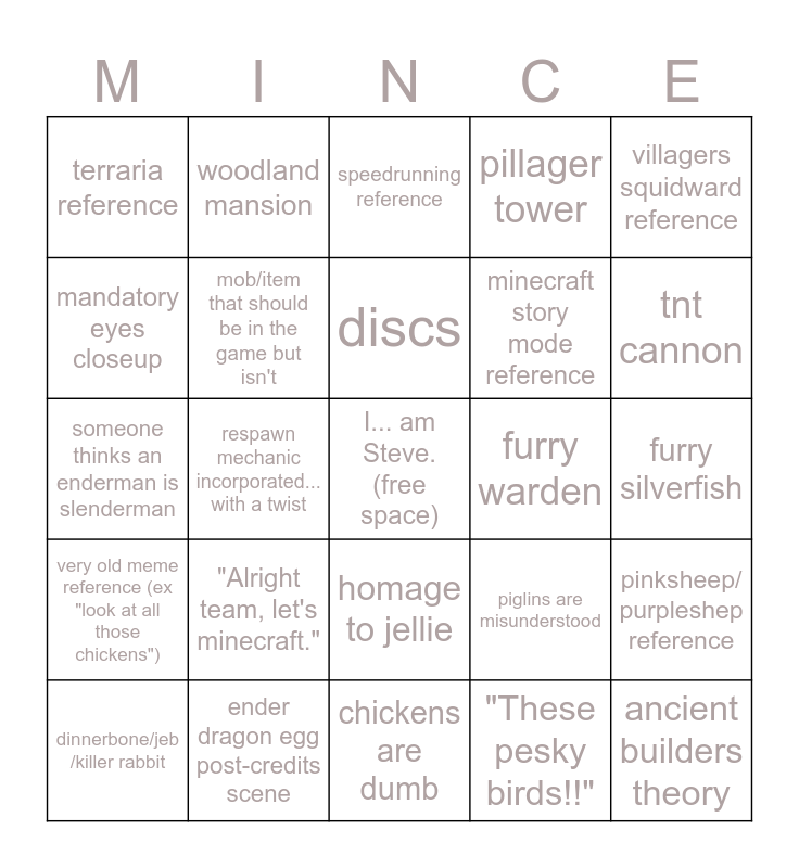 This bingo card has a free space and 24 words: "Alright team, let's minecraft.", ender dragon egg post-credits scene, discs, dinnerbone/jeb /killer rabbit, villagers squidward reference, terraria reference, mandatory eyes closeup, woodland mansion, furry warden, homage to jellie, minecraft story mode reference, someone thinks an enderman is slenderman, piglins are misunderstood, pinksheep/ purpleshep reference, mob/item that should be in the game but isn't, "These pesky birds!!", furry silverfish, speedrunning reference, tnt cannon, respawn mechanic incorporated... with a twist, ancient builders theory, very old meme reference (ex "look at all those chickens"), pillager tower and chickens are dumb.