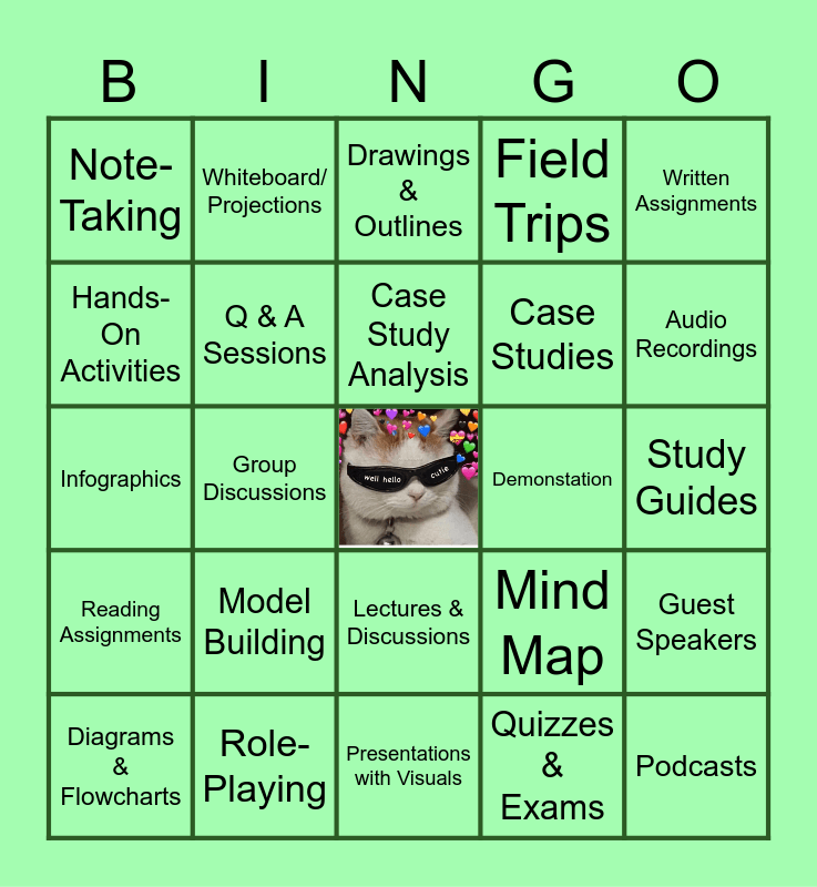 This bingo card has a free space and 24 words: Diagrams & Flowcharts, Model Building, Case Study Analysis, Quizzes & Exams, Written Assignments, Note-Taking, Whiteboard/ Projections, Drawings & Outlines, Demonstation, Study Guides, Infographics, Q & A Sessions, Mind Map, Guest Speakers, Hands-On Activities, Role-Playing, Presentations with Visuals, Field Trips, Audio Recordings, Reading Assignments, Group Discussions, Lectures & Discussions, Case Studies and Podcasts.