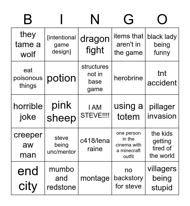 This bingo card has a free space and 24 words: steve being unc/mentor, mumbo and redstone, structures not in base game, end city, black lady being funny, they tame a wolf, eat poisonous things, [intentional game design], using a totem, c418/lena raine, herobrine, horrible joke, one person in the cinema with a minecraft outfit, the kids getting tired of the world, potion, no backstory for steve, pillager invasion, dragon fight, tnt accident, pink sheep, villagers being stupid, creeper aw man, items that aren't in the game and montage.