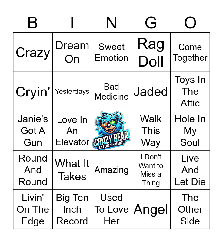 This bingo card has a free space and 26 words: Amazing, Angel, Bad Medicine, Big Ten Inch Record, Come Together, Crazy, Cryin', Dream On, Hole In My Soul, I Don't Want to Miss a Thing, Jaded, Janie's Got A Gun, Live And Let Die, Livin' On The Edge, Love In An Elevator, Pink, Rag Doll, Round And Round, Sweet Emotion, The Other Side, Toys In The Attic, Used To Love Her, Walk This Way, What It Takes, Yesterdays and You See Me Crying.