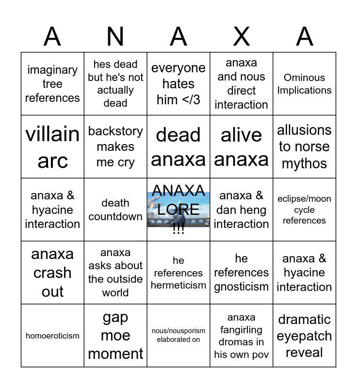 This bingo card has a free space and 24 words: anaxa asks about the outside world, gap moe moment, dead anaxa, homoeroticism, Ominous Implications, imaginary tree references, villain arc, hes dead but he's not actually dead, anaxa & dan heng interaction, he references hermeticism, alive anaxa, anaxa & hyacine interaction, he references gnosticism, anaxa & hyacine interaction, backstory makes me cry, anaxa fangirling dromas in his own pov, eclipse/moon cycle references, everyone hates him </3, allusions to norse mythos, death countdown, dramatic eyepatch reveal, anaxa crash out, anaxa and nous direct interaction and nous/nousporism elaborated on.