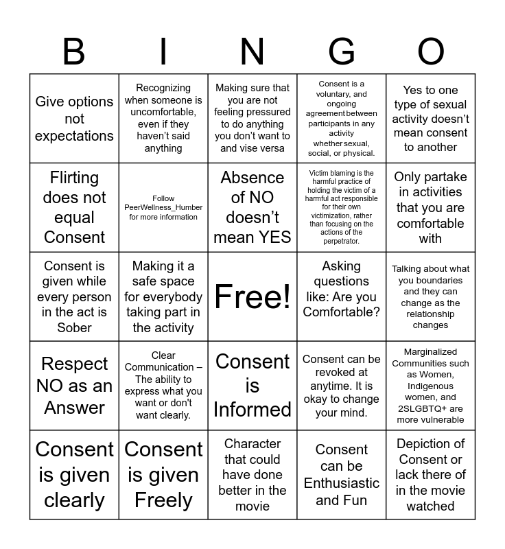 This bingo card has a free space and 24 words: Clear Communication – The ability to express what you want or don't want clearly., Consent is given Freely, Absence of NO doesn’t mean YES, Consent is given clearly, Yes to one type of sexual activity doesn’t mean consent to another, Give options not expectations, Flirting does not equal Consent, Recognizing when someone is uncomfortable, even if they haven’t said anything, Asking questions like: Are you Comfortable?, Consent is Informed, Victim blaming is the harmful practice of holding the victim of a harmful act responsible for their own victimization, rather than focusing on the actions of the perpetrator., Consent is given while every person in the act is Sober, Consent can be revoked at anytime. It is okay to change your mind., Marginalized Communities such as Women, Indigenous women, and 2SLGBTQ+ are more vulnerable, Follow PeerWellness_Humber for more information, Consent can be Enthusiastic and Fun, Talking about what you boundaries and they can change as the relationship changes, Making sure that you are not feeling pressured to do anything you don’t want to and vise versa, Only partake in activities that you are comfortable with, Making it a safe space for everybody taking part in the activity, Depiction of Consent or lack there of in the movie watched, Respect NO as an Answer, Consent is a voluntary, and ongoing agreement between participants in any activity whether sexual, social, or physical. and Character that could have done better in the movie.