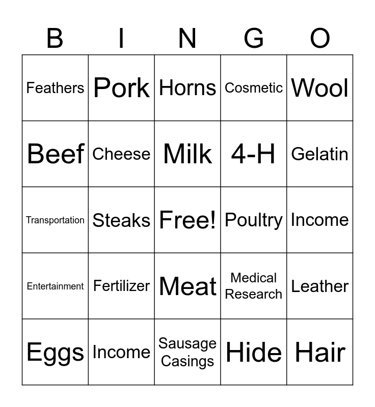 This bingo card has a free space and 24 words: Fertilizer, Income, Milk, Eggs, Wool, Feathers, Beef, Pork, Poultry, Meat, 4-H, Transportation, Medical Research, Leather, Cheese, Hide, Income, Horns, Gelatin, Steaks, Hair, Entertainment, Cosmetic and Sausage Casings.