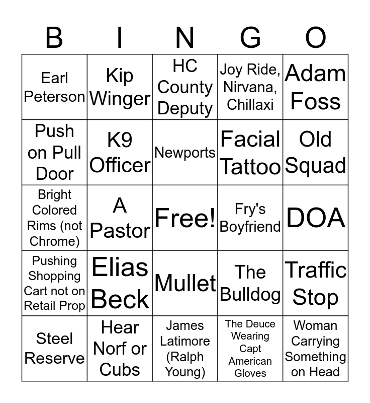 This bingo card has a free space and 24 words: Elias Beck, Hear Norf or Cubs, Newports, Steel Reserve, Adam Foss, Earl Peterson, Push on Pull Door, Kip Winger, Fry's Boyfriend, Mullet, Facial Tattoo, Bright Colored Rims (not Chrome), The Bulldog, Traffic Stop, K9 Officer, The Deuce Wearing Capt American Gloves, DOA, HC County Deputy, Old Squad, A Pastor, Woman Carrying Something on Head, Pushing Shopping Cart not on Retail Prop, Joy Ride, Nirvana, Chillaxi and James Latimore (Ralph Young).