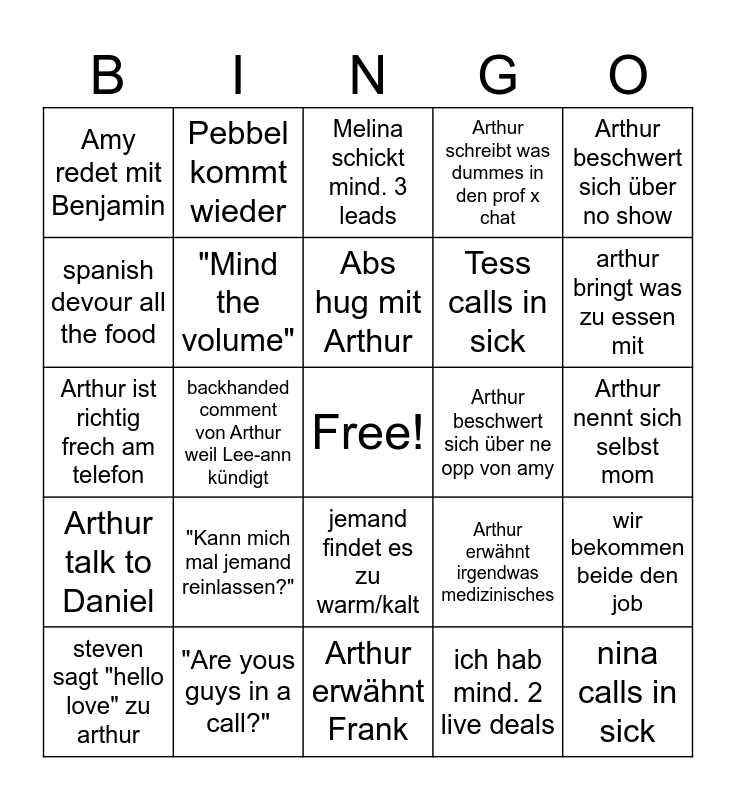 This bingo card has a free space and 24 words: "Kann mich mal jemand reinlassen?", "Are yous guys in a call?", Abs hug mit Arthur, steven sagt "hello love" zu arthur, Arthur beschwert sich über no show, Amy redet mit Benjamin, spanish devour all the food, Pebbel kommt wieder, Arthur beschwert sich über ne opp von amy, jemand findet es zu warm/kalt, Tess calls in sick, Arthur ist richtig frech am telefon, Arthur erwähnt irgendwas medizinisches, wir bekommen beide den job, "Mind the volume", ich hab mind. 2 live deals, Arthur nennt sich selbst mom, Melina schickt mind. 3 leads, arthur bringt was zu essen mit, backhanded comment von Arthur weil Lee-ann kündigt, nina calls in sick, Arthur talk to Daniel, Arthur schreibt was dummes in den prof x chat and Arthur erwähnt Frank.