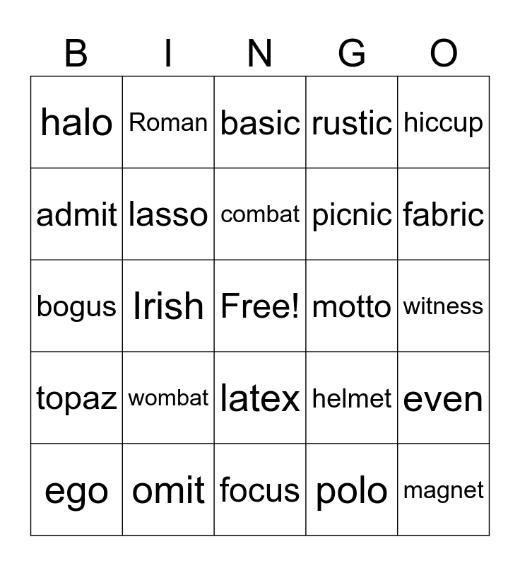 This bingo card has a free space and 24 words: wombat, omit, combat, ego, hiccup, halo, admit, Roman, motto, latex, picnic, bogus, helmet, even, lasso, polo, witness, basic, fabric, Irish, magnet, topaz, rustic and focus.