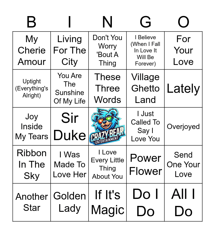 This bingo card has a free space and 43 words: A Place In The Sun, All I Do, All In Love Is Fair, Another Star, As, Do I Do, Don't You Worry 'Bout A Thing, Ebony Eyes, For Your Love, Golden Lady, I Believe (When I Fall In Love It Will Be Forever), I Just Called To Say I Love You, I Love Every Little Thing About You, I Was Made To Love Her, I Wish, If It's Magic, If You Really Love Me, Joy Inside My Tears, Knocks Me Off My Feet, Lately, Living For The City, Love Light In Flight, Love's In Need Of Love Today, My Cherie Amour, Ordinary Pain, Overjoyed, Part-Time Lover, Pastime Paradise, Power Flower, Ribbon In The Sky, Saturn, Send One Your Love, Signed, Sealed, Delivered (I'm Yours), Sir Duke, Summer Soft, That Girl, The Secret Life Of Plants, These Three Words, Uptight (Everything's Alright), Village Ghetto Land, You And I, You Are The Sunshine Of My Life and You Haven't Done Nothin'.