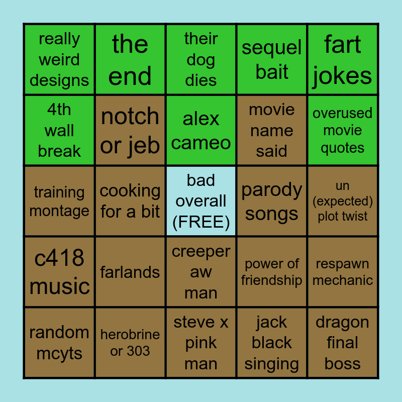 This bingo card has a free space and 24 words: farlands, herobrine or 303, alex cameo, random mcyts, fart jokes, really weird designs, 4th wall break, the end, parody songs, creeper aw man, movie name said, training montage, power of friendship, respawn mechanic, notch or jeb, jack black singing, un (expected) plot twist, their dog dies, overused movie quotes, cooking for a bit, dragon final boss, c418 music, sequel bait and steve x pink man.