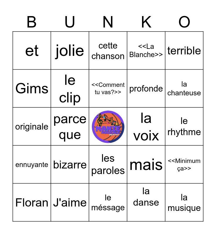 This bingo card has a free space and 30 words: J'aime, Je n'aime pas, parce que, est, et, cette chanson, le clip, les paroles, la voix, le méssage, le rhythme, la musique, la danse, le chanteur, la chanteuse, les instruments, mais, ennuyante, bizarre, terrible, originale, intéressante, jolie, profonde, Gims, <<La Blanche>>, <<Minimum ça>>, Floran, <<Comment tu vas?>> and <<Casser la table>>.