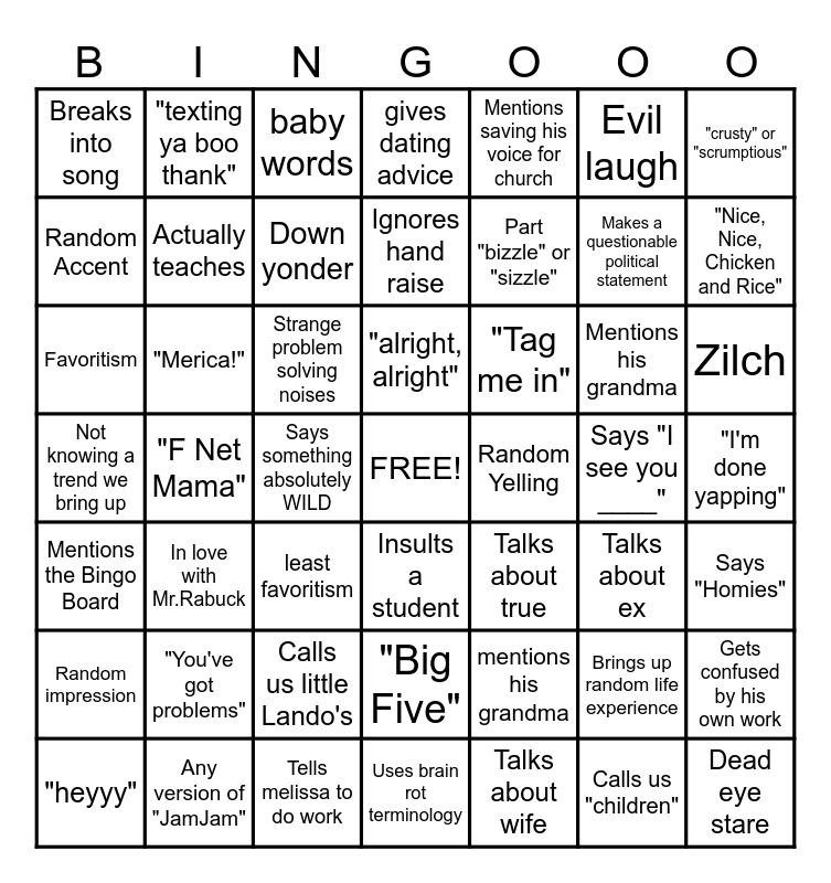This bingo card has a free space and 48 words: mentions his grandma, Makes a questionable political statement, Uses brain rot terminology, "F Net Mama", Strange problem solving noises, "I'm done yapping", "texting ya boo thank", Any version of "JamJam", Evil laugh, Insults a student, "crusty" or "scrumptious", gives dating advice, Mentions his grandma, "Tag me in", Random impression, Says "I see you ____", Random Accent, "Nice, Nice, Chicken and Rice", Brings up random life experience, Mentions saving his voice for church, Part "bizzle" or "sizzle", Says something absolutely WILD, Breaks into song, Actually teaches, Gets confused by his own work, Down yonder, Zilch, "heyyy", "alright, alright", "Merica!", Calls us "children", Random Yelling, Says "Homies", "You've got problems", Not knowing a trend we bring up, Talks about true, Talks about ex, Favoritism, least favoritism, Calls us little Lando's, Mentions the Bingo Board, Dead eye stare, baby words, Tells melissa to do work, Ignores hand raise, "Big Five", In love with Mr.Rabuck and Talks about wife.